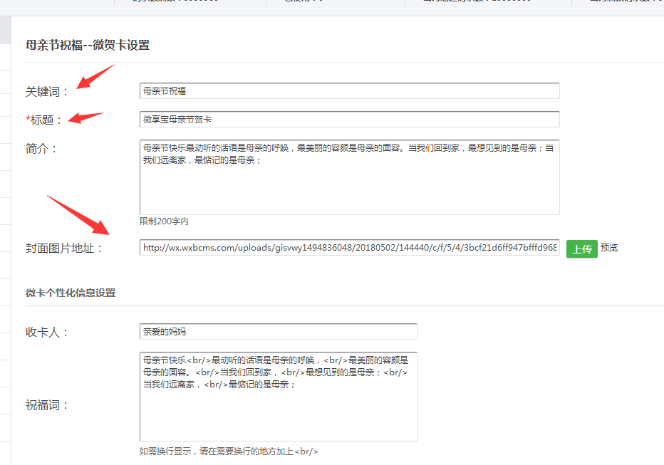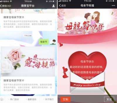 在母親節(jié)來臨之前,準備一款感人的微信賀卡,能給節(jié)假日增添很多氣氛,每到節(jié)日都是公眾號里邊最熱鬧的時候,各個公眾號的商家都紛紛推出自己準備好的母親節(jié)微信活動,制作微信活動需要使用到微享寶平臺提供的微信營銷功能,小編拿微信賀卡活動來做例子,講講如何制作母親節(jié)的微信公眾號賀卡活動,微信賀卡圖文詳解.