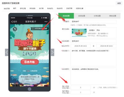 第三步:.點(diǎn)擊游戲庫,找到游戲位置,里邊有最新的游戲,所有游戲制作過程和參與方式都是一樣的,教程以屈原吃粽子為例子,鼠標(biāo)點(diǎn)擊游戲圖標(biāo)右邊的我要定制按鈕,就進(jìn)到編輯頁面了??梢钥吹阶筮吺穷A(yù)覽框,上面是導(dǎo)航菜單,右側(cè)是編輯區(qū)域,切換到需要編輯的選項(xiàng),在預(yù)覽框里點(diǎn)一下,就可以在右側(cè)修改了。