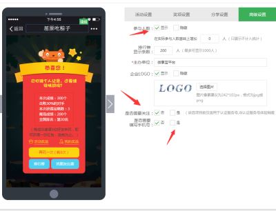 第四步:獎(jiǎng)項(xiàng)設(shè)置,選擇類型,設(shè)置數(shù)量,注意兌獎(jiǎng)時(shí)間的設(shè)置要在游戲結(jié)束以后,然后切換到高級(jí)設(shè)置,設(shè)置虛擬人數(shù)、排行榜顯示數(shù)、版權(quán)及上傳Logo,關(guān)鍵是最后兩項(xiàng),設(shè)置需要關(guān)注和設(shè)置需要填寫手機(jī)號(hào),設(shè)置完以后點(diǎn)擊保存,提示設(shè)置成功,然后彈窗是否發(fā)布.