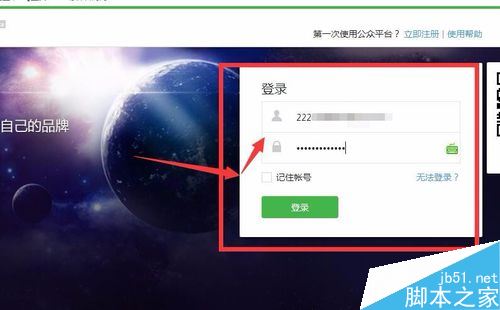 當(dāng)我們進(jìn)入“微信公眾平臺(tái)”我們輸入登錄名和密碼(這里已經(jīng)標(biāo)注出來(lái)了,登錄名有郵箱,微信號(hào),QQ號(hào)碼)