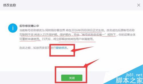 當(dāng)我們修改好了,這時(shí)候就會(huì)出現(xiàn)下面的說(shuō)明,名稱有一個(gè)15天的保護(hù)期和贖回期,而且我們還能撤銷修改!