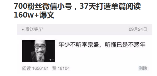 現(xiàn)在人都缺乏認(rèn)同感,總覺不被別人理解,但是讀到一些陳年爛雞湯,立馬感同身受,多年不被人理解的小委屈終于有人說透了,終于被人理解了,然后一個個傲嬌的想著“我要轉(zhuǎn)發(fā)讓別人了解我的感受”。這就是為什么近些年來,公眾號10+閱讀的文章很多都是雞湯文。一個典型,一個不足千粉的小號打造了一篇《年少不聽李宗盛,聽懂已是不惑年》的爆文,但筆者看來,也就是新瓶裝舊雞湯,讓多少老爺們兒矯情了一把“都沒人懂我的情懷,這篇文章說中了,我轉(zhuǎn)!”,一不小心就爆了。