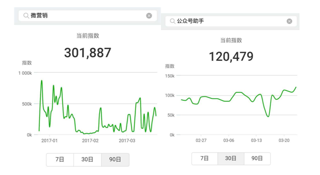 而且整個(gè)使用也是顛覆了以往的使用方式,不需要關(guān)注,沒(méi)有客戶端和服務(wù)入口,只需要在微信客戶端的搜索欄內(nèi)輸入“微信指數(shù)”就能直接打開(kāi)“微信指數(shù)”的搜索頁(yè)面。然后輸入關(guān)鍵詞,“微信指數(shù)”會(huì)整合整個(gè)微信搜素和瀏覽行為,然后列出搜索關(guān)鍵詞的搜索量變化,并且可以生產(chǎn)7日、30日、90日,也就是周、月、季的搜索量變化曲線圖。也可以在微信搜索欄內(nèi)輸入“XX微信指數(shù)”或“微信指數(shù)XX”進(jìn)行直接搜索。至此幾大互聯(lián)網(wǎng)巨頭BAT都擁有自己的輿情熱度指數(shù)搜索——“百度指數(shù)”“淘寶指數(shù)”“微信指數(shù)”。