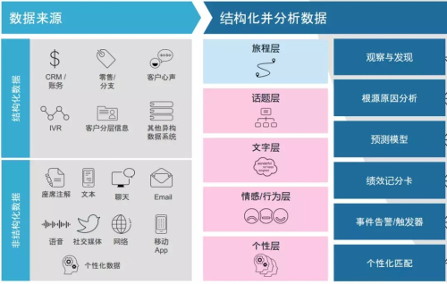 比如NICE Nexidia Analytics全渠道交互數(shù)據(jù)分析方案,就可以運用機器學習和預測建模的最新技術,將企業(yè)聯(lián)絡中心中涉及的聊天、郵件、語音、社交媒體等等多個方面的大量非結構化數(shù)據(jù)進行結構化處理。通過把這類數(shù)據(jù)和企業(yè)運營方面的結構化數(shù)據(jù)進行同質(zhì)化處理,建立起旅程、話題、文字、情感/行為、個性等五層數(shù)據(jù)分析模型。