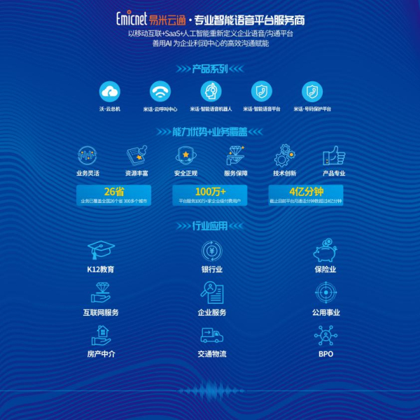 很多大中型企業(yè)選擇由專業(yè)智能語音平臺(tái)服務(wù)商--易米云通來搭建智能語音平臺(tái),首先是考慮到其提供的安全、穩(wěn)定和規(guī)范的線路是有利于企業(yè)長(zhǎng)期穩(wěn)健發(fā)展的。截至目前,易米云通在全國26省、300+城市與運(yùn)營商合作開展正規(guī)業(yè)務(wù),服務(wù)超過100萬+企業(yè)級(jí)用戶,擁有固定號(hào)碼資源,落地號(hào)碼資源一點(diǎn)接入,全國可用。其次,企業(yè)在業(yè)務(wù)增長(zhǎng)的高峰期前都會(huì)遇到傳統(tǒng)呼叫中心擴(kuò)容升級(jí)的問題。數(shù)據(jù)統(tǒng)計(jì)顯示,支持高并發(fā)量的米話呼叫中心可提升坐席工作率,并且外呼顯示當(dāng)?shù)靥?hào)碼的通話號(hào)碼可使接通率得以大大提升。