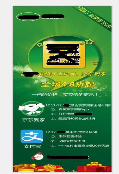 在分析完用戶心理后,他們開始著重進(jìn)行活動策劃的相關(guān)安排。活動是以線上線下同步展開的方式進(jìn)行?;顒觾?nèi)容主要以商品打折為噱頭。4.8折的商品折扣已足夠吸引力,如果再免費(fèi)送到家呢?而且使用京東APP與支付寶的用戶,在4.8折的基礎(chǔ)上將另有優(yōu)惠,在幾重優(yōu)惠的吸引下,他們相信用戶一定會被打動。