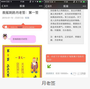 2、能否在別人的基礎(chǔ)上進(jìn)行創(chuàng)新。雖然“新年簽”這個(gè)創(chuàng)意不錯(cuò),但是同時(shí)做的微信公眾號(hào)太多了,當(dāng)大家的創(chuàng)意都差不多的時(shí)候,比拼的就是傳播渠道,而我們這個(gè)2000多粉絲的微信公眾號(hào)在這方面肯定是處于劣勢(shì)的。所以這個(gè)時(shí)候,我們打算把“新年簽”改成“月老簽”,一方面避開了“新年簽”的激烈競(jìng)爭(zhēng),另一方面也與我們的公眾號(hào)的定位更為匹配。