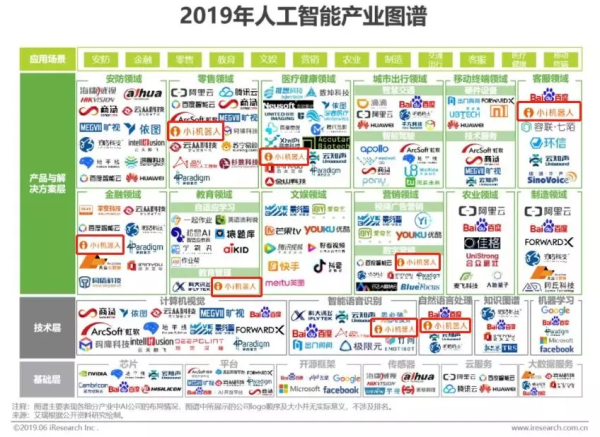 報(bào)告通過縱橫兩個(gè)維度全面、直觀地勾勒了2019年人工智能產(chǎn)業(yè)圖譜,揭曉了不同賽道的強(qiáng)勢(shì)企業(yè)。圖譜橫向?yàn)榘卜馈⒔鹑?、客服、醫(yī)療健康、零售、廣告營(yíng)銷、教育、城市交通、制造、農(nóng)業(yè)等十大傳統(tǒng)產(chǎn)業(yè)應(yīng)用,縱向包括人工智能基礎(chǔ)層、技術(shù)層、產(chǎn)業(yè)與解決方案層三個(gè)層面。其中小i機(jī)器人成為2019年人工智能產(chǎn)業(yè)圖譜中最高頻亮相的企業(yè)之一,是多個(gè)領(lǐng)域AI商業(yè)落地的領(lǐng)先代表。同時(shí),百度、科大訊飛、華為、阿里、曠視等知名企業(yè)也多次出現(xiàn)在該圖譜中。