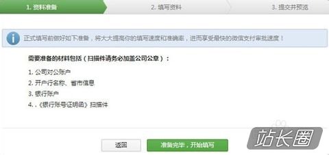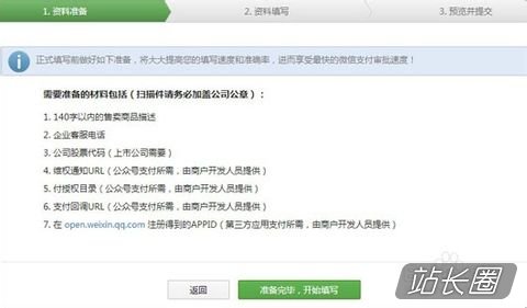 業(yè)務(wù)審核資料填寫二:根據(jù)提示步驟,提前準備好資料,點擊》=準備完畢,填寫資料。這里需要填寫,商戶負責人信息和商戶基本信息。