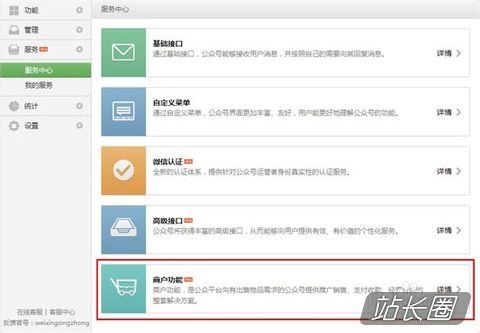 登錄微信公眾平臺,點擊“服務(wù)”功能欄下的“服務(wù)中心”模塊,再點擊右側(cè)的“商戶功能”模塊。