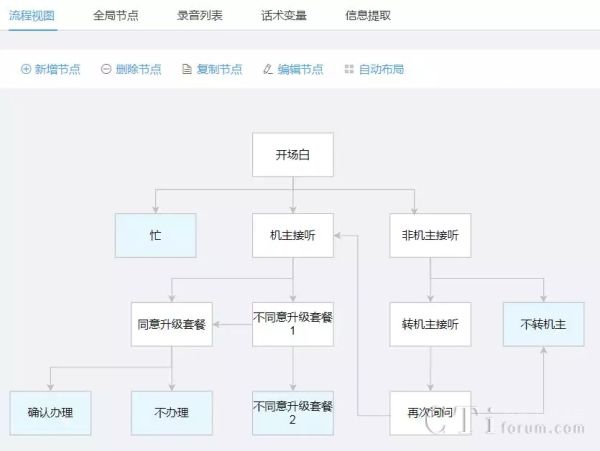 智能語(yǔ)音外呼機(jī)器人如何做外呼業(yè)務(wù)呢?以4G升5G套餐推廣為例,用可視化的編輯器,編輯外呼流程:
