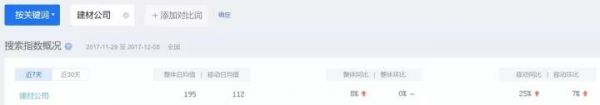 比如下圖,我們可以明顯看出“建材公司”這個關(guān)鍵詞pc端明顯要高于移動,所以我們在投放關(guān)鍵詞時就可根據(jù)用戶的的設(shè)備搜索比例來進(jìn)行投放。