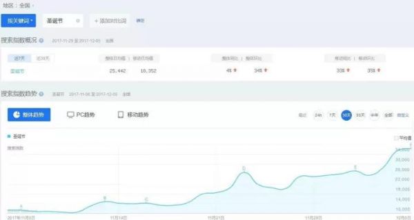 距圣誕節(jié)還有20天左右,可是“圣誕節(jié)”的搜索量已經(jīng)高達(dá)34000,試問競價員們,如此高的流量,你忍心錯過嗎!