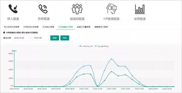 系統(tǒng)可根據(jù)呼入、外呼、技能組、IVR按鍵、坐席等提供數(shù)據(jù)報表,可自行篩選及分組,系統(tǒng)提供了多種圖表樣式。