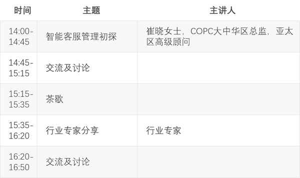 請(qǐng)?jiān)?019年5月13日之前,發(fā)送郵件至fjin@copc.com或dcheng@copc.com,提供公司、姓名、職務(wù)、電話(huà)和郵箱信息,COPC會(huì)根據(jù)先后確認(rèn)您的報(bào)名。由于參與名額有限,請(qǐng)您提早報(bào)名以確保您的席位。我們期待您的光臨!
