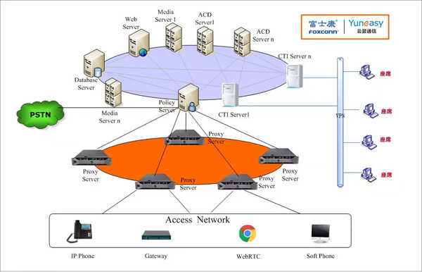 云翌通信為富士康量身打造SaaS云呼叫中心,采用分布式部署,并對核心模塊采取負(fù)載均衡的方案,數(shù)據(jù)庫讀寫分離,保證系統(tǒng)的大容量運(yùn)行和系統(tǒng)高穩(wěn)定性;系統(tǒng)部署在內(nèi)網(wǎng),提供給富士康內(nèi)部的各個部門和子企業(yè)使用,數(shù)據(jù)與外界獨立,且內(nèi)部互通,方便維護(hù);多企業(yè)在一套系統(tǒng)中,方便統(tǒng)一管理,且各個企業(yè)之間數(shù)據(jù)互不干擾;方案成熟,無縫對接上層華為PBX及下層各個廠家的IP話機(jī)。