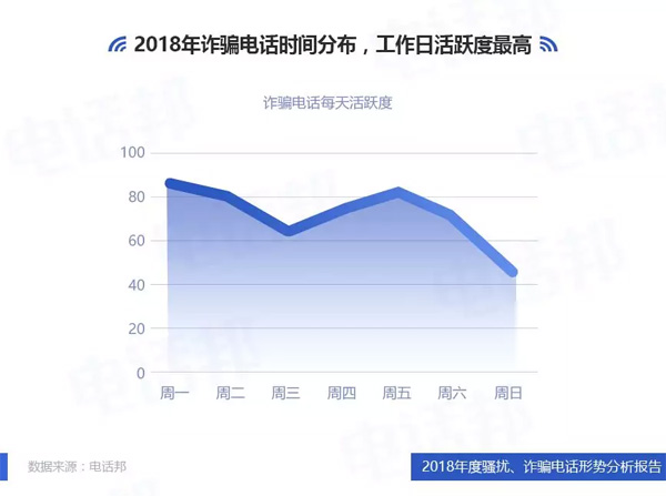 3、2018年詐騙電話時間分布,工作日活躍度最高