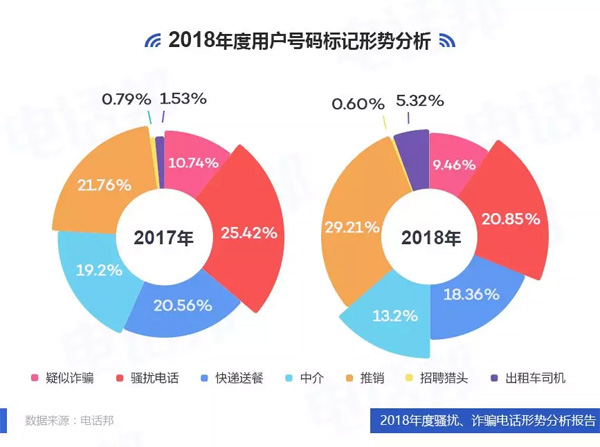 回顧2018年,通訊信息詐騙情況得到有效緩解,詐騙電話的標記次數(shù)大幅度下降,騷擾電話成為用戶的最大困擾,尤其是不斷爆出的用戶信息泄露事件,導致騷擾電話情況比較嚴峻,威脅著用戶的通話安全。