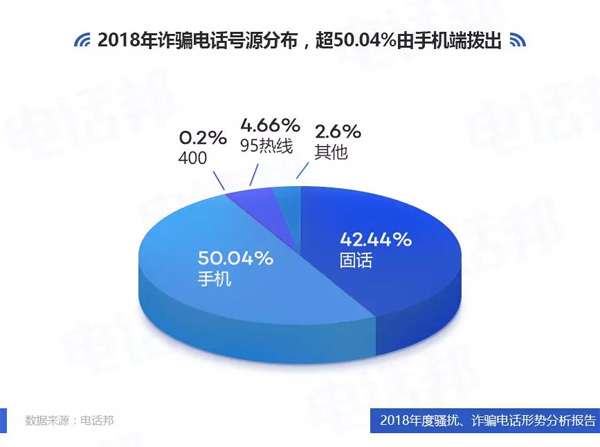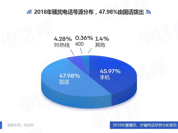 2、2018年騷擾電話號源分布,47.98%由固話撥出