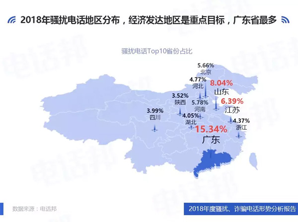 據(jù)電話邦大數(shù)據(jù)顯示,在騷擾電話的區(qū)域分布方面,經(jīng)濟發(fā)達地區(qū)和省份是重點目標。撥出騷擾電話量最多的TOP10省份分別為:廣東、山東、江蘇、河南、北京、河北、浙江、湖北、陜西和四川。其中廣東省撥出騷擾電話量最高,占比15.34%,其次是山東省和江蘇省,占比分別為8.04%和6.39%。