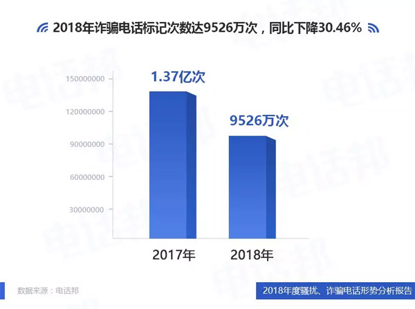 1、2018年詐騙電話標記次數(shù)達9526萬次,同比下降30.46%