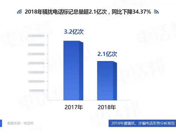 1、2018年騷擾電話標記總量超2.1億次,同比下降34.37%