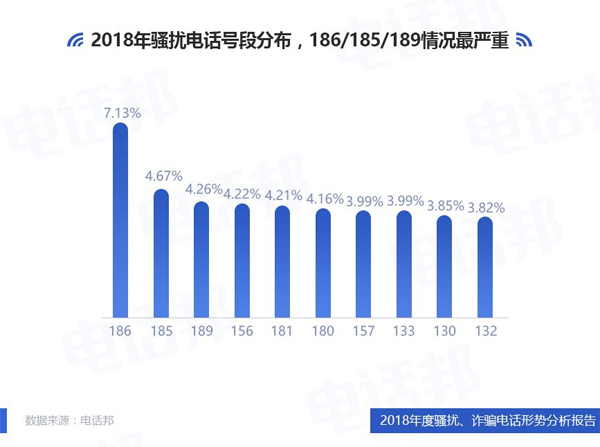 在騷擾電話手機號段分布中,186/185/189情況最嚴重,占比分別為:7.13%、4.67%、4.26%。作為往年的重災區(qū),虛擬運營商專屬號段170/171已得到有效治理,而186/185號段連續(xù)兩年“上榜”,成為新的重災區(qū),需要引起關注。
