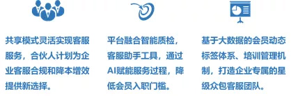 平臺具備眾包運營、云端平臺、質量管控、培訓認證、精準營銷、智能客服六大功能要素。通過AI賦能共享,實現(xiàn)市場人力資源與企業(yè)客服需求的高低峰匹配。