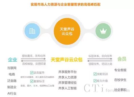 “天堂聲谷”云眾包,通過專業(yè)SaaS平臺,接收企業(yè)服務任務,依據(jù)動態(tài)標簽體系定向推送任務給適配會員。會員領取任務通過培訓或認證后,接受平臺調度上線服務。平臺對服務進度與質量進行過程監(jiān)控,服務結果通過企業(yè)核驗后,會員即可獲得薪酬獎勵。