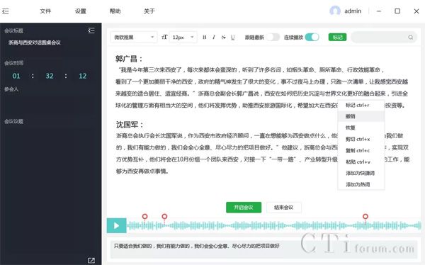 適用于多人會議,會議發(fā)言實時轉(zhuǎn)寫,并分角色呈現(xiàn)。對于需要校核的文字,點擊便可播放對應(yīng)錄音,快速進(jìn)行修改。