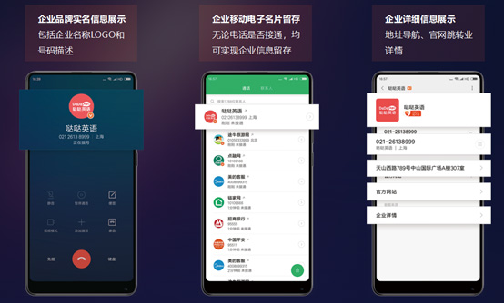 電話邦企服基于號(hào)碼大數(shù)據(jù),在移動(dòng)終端為企業(yè)客戶提供號(hào)碼關(guān)聯(lián)、品牌宣傳和品牌保護(hù)的功能型產(chǎn)品。幫助企業(yè)提高號(hào)碼辨識(shí)度、提升品牌形象、打造移動(dòng)商譽(yù),讓號(hào)碼更可信、安全、準(zhǔn)確。