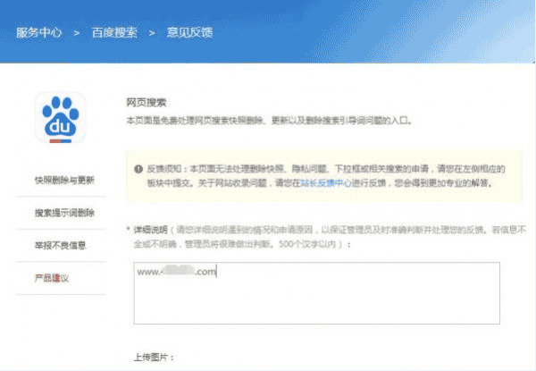 除了利用robots文件禁止蜘蛛爬行之外,小編還在百度的服務(wù)中心(http://help.baidu.com/webmaster/add?rdm=1akn086v3#4)又一次提交了該頁面。當(dāng)然這是小編針對(duì)該問題實(shí)行的解決方式,并不是每位站長(zhǎng)都像小編一樣,不知道該如何操作吧!