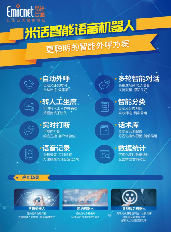 而易米云通新近研發(fā)的米話·智能語音機(jī)器人以助力企業(yè)電銷團(tuán)隊提升競爭力為目標(biāo),打造毫秒級響應(yīng)時間的極速處理客戶服務(wù)體系,幫助企業(yè)建立365天*24小時無間斷工作模式,助力企業(yè)電銷團(tuán)隊7*24小時隨時隨地處理客戶問題,及時把握稍縱即逝的寶貴商機(jī)。