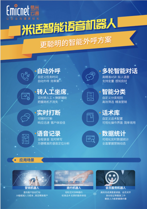 作為專業(yè)智能語音平臺服務(wù)商,易米云通新近研發(fā)的米話·智能語音機器人早已為銀行業(yè)通信技術(shù)迭代升級,讓催繳還款更加便捷高效,提供了全方位的解決方案。在人力資源緊張,擴招新人困難的今天,利用智能語音機器人處理重復(fù)性工作,助力人工提升工作效率,已經(jīng)成為銀行業(yè)的不二之選。