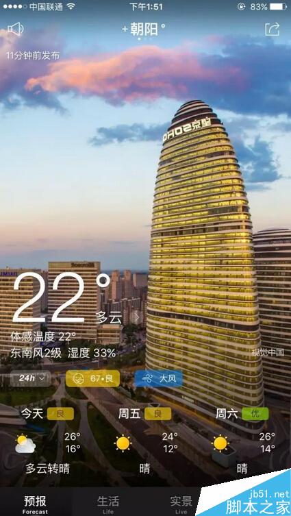 天氣通的背景圖片都很美,而且可以根據(jù)用戶所在的地理位置,展現(xiàn)附近的標志性建筑。比如,我就經(jīng)常能刷到望京SOHO。