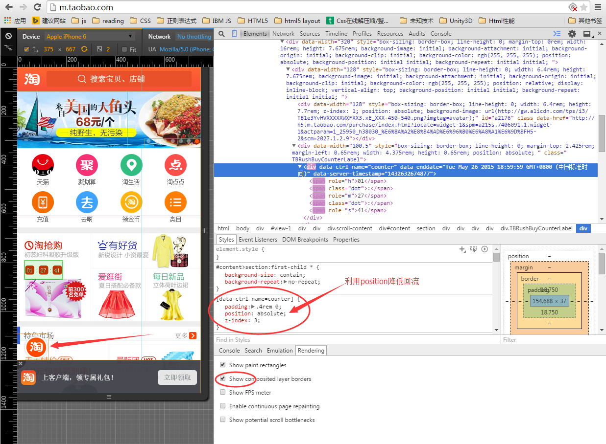 看上去挺多挺復(fù)雜的,其實(shí)最簡(jiǎn)單、最容易理解、也最容易濫用的是第一條。實(shí)現(xiàn)第一條僅需要在元素的樣式里加上。transform:translateZ(0);-webkit-transform:translateZ(0); 就可以了。我們將淘寶往下滑動(dòng)一點(diǎn),找一個(gè)元素試試看。
