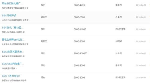 第一,繼續(xù)堅(jiān)持在原創(chuàng)的道路上厚積薄發(fā)。我們先看如上圖示,整張圖是西安這邊的招聘seo信息,通過(guò)以上圖示我們不難發(fā)現(xiàn)seo薪資還是非常給力的,但是作為站長(zhǎng)我們?yōu)槭裁匆獔?jiān)持優(yōu)質(zhì)的內(nèi)容為核心呢?筆者發(fā)現(xiàn)2015年年底到2016年注定是自媒體營(yíng)銷爆發(fā)的關(guān)鍵一年,作為企業(yè)網(wǎng)站我們?nèi)绾卧谌找娓?jìng)爭(zhēng)的多元化營(yíng)銷過(guò)程中厚積薄發(fā),一定要繼續(xù)在優(yōu)質(zhì)的文章內(nèi)容上下功夫,作為2016年自媒體微商爆發(fā)的一年筆者發(fā)現(xiàn),無(wú)論微商營(yíng)銷的心靈雞湯文章還是做自媒體進(jìn)行軟文營(yíng)銷,你的文章質(zhì)量是營(yíng)銷取勝的關(guān)鍵所在,所以說(shuō)我我們?nèi)绻?016年繼續(xù)讓企業(yè)網(wǎng)站發(fā)力,那么,遵守優(yōu)質(zhì)的內(nèi)容營(yíng)銷是實(shí)在必行的,當(dāng)下企業(yè)網(wǎng)站站長(zhǎng)必須明白,如果網(wǎng)站的內(nèi)容還靠偽原創(chuàng)或者復(fù)制來(lái)進(jìn)行seo優(yōu)化勢(shì)必是非常讓人值得惋惜的,2016年搜素引擎會(huì)對(duì)原創(chuàng)內(nèi)容豐富的網(wǎng)站給予很高的權(quán)重,站內(nèi)優(yōu)化尤其是優(yōu)質(zhì)文章勢(shì)必是用戶體驗(yàn)度提升最有力的武器。