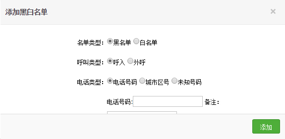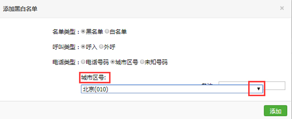 首先勾選對應(yīng)的名單類型及呼叫類型;電話類型中可直接輸入電話號碼添加;選擇城市區(qū)號添加,則系統(tǒng)會按照區(qū)號進(jìn)行屏蔽,比如添加北京010區(qū)號為呼入黑名單,則北京地區(qū)號碼無法呼入系統(tǒng)。