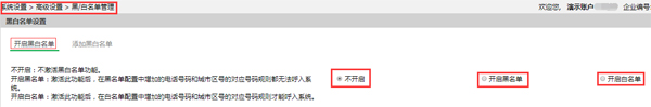 登錄天潤融通Clink系統(tǒng)管理員后臺,點開“系統(tǒng)設(shè)置”下的“高級設(shè)置”,選擇“黑白名單”??梢钥吹浇缑嬗腥齻€選項:
