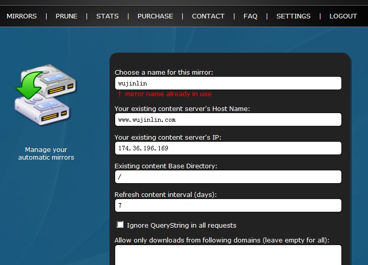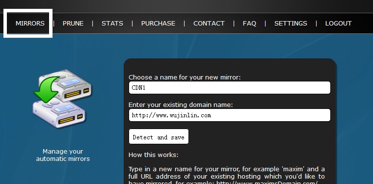 4.登陸之后點擊左上角的MIRRORS進入管理CDN界面,填寫名稱(名稱任意)和你的博客地址,然后點擊Detect and save進入下一步: