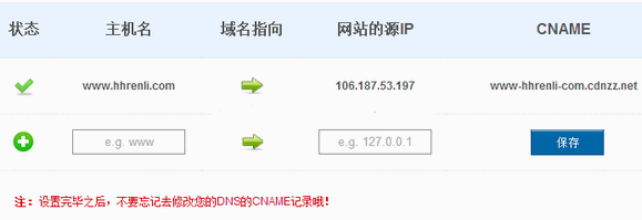 4.在域名后臺(tái)添加上一步系統(tǒng)生成的CNAME,保存即可