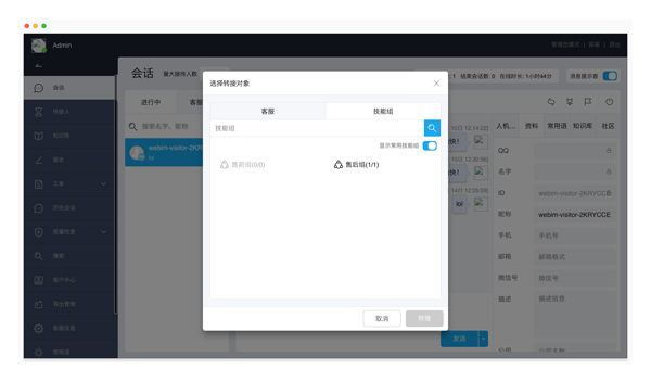 支持客服設(shè)置常用技能組列表,便于轉(zhuǎn)接會(huì)話(huà)時(shí)快速選擇技能組。
