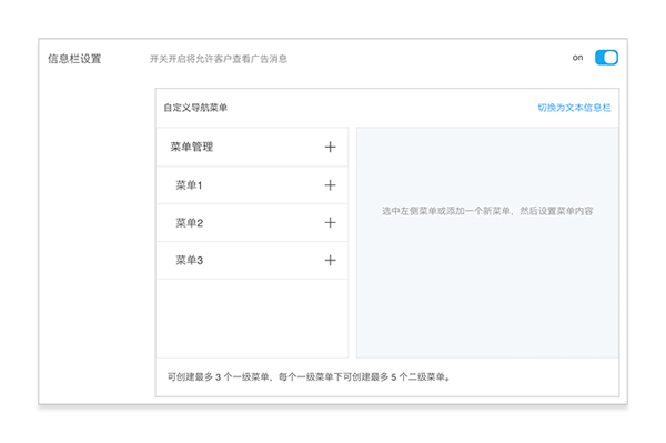 支持將文本信息欄切換為自定義導(dǎo)航菜單,并展示在聊天窗口。自定義導(dǎo)航菜單包含一級(jí)菜單和二級(jí)菜單,可創(chuàng)建最多3個(gè)一級(jí)菜單,每個(gè)一級(jí)菜單下可創(chuàng)建最多5個(gè)二級(jí)菜單??稍诓藛紊显O(shè)置圖文消息(從素材庫(kù)選擇),當(dāng)訪(fǎng)客點(diǎn)擊菜單項(xiàng)時(shí),自動(dòng)向訪(fǎng)客發(fā)送對(duì)應(yīng)的圖文消息。
