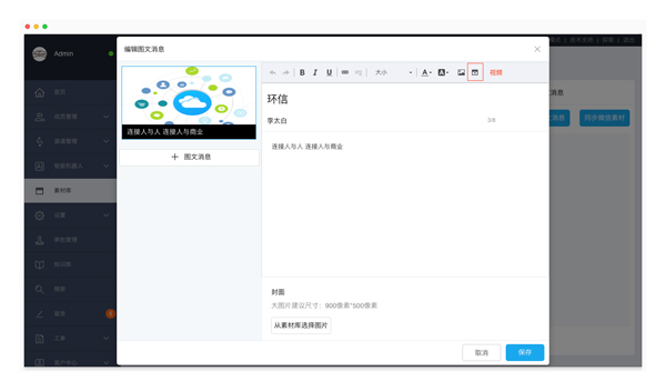 支持在圖文消息的正文中添加視頻鏈接,豐富圖文消息的展現(xiàn)形式,可用于客服知識(shí)庫(kù)、機(jī)器人知識(shí)規(guī)則等場(chǎng)景。目前僅支持。mp4格式的視頻。
