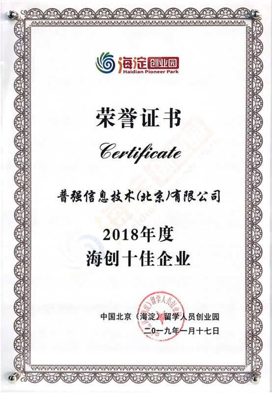 普強信息在本次活動中榮獲“2018年度海創(chuàng)十佳企業(yè)”。