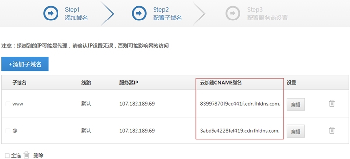 這里我們設(shè)置解析的IP,如果我們的域名已經(jīng)有解析,會自動檢索進(jìn)來。最后我們需要在域名解析面板設(shè)置@和www的別名CNAME解析,對應(yīng)百度云加速給予的兩個地址。
