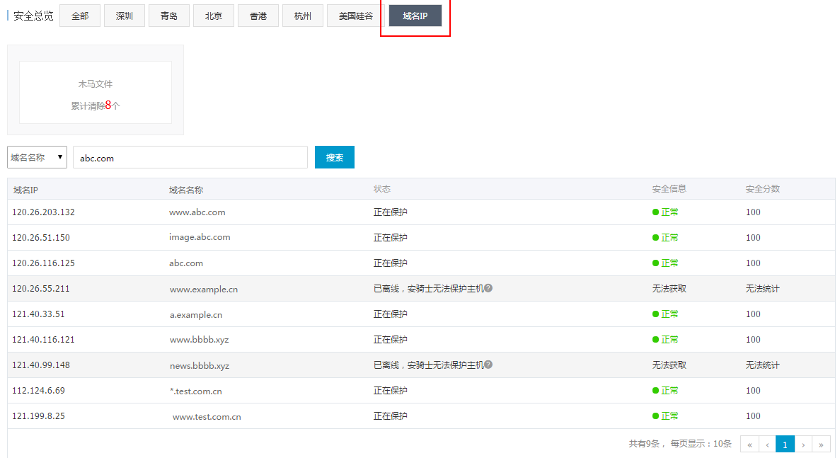 點擊跳轉(zhuǎn)到“云盾 – 安騎士 – 安全總覽 – 域名IP”列表頁面; 效果如下圖所示: