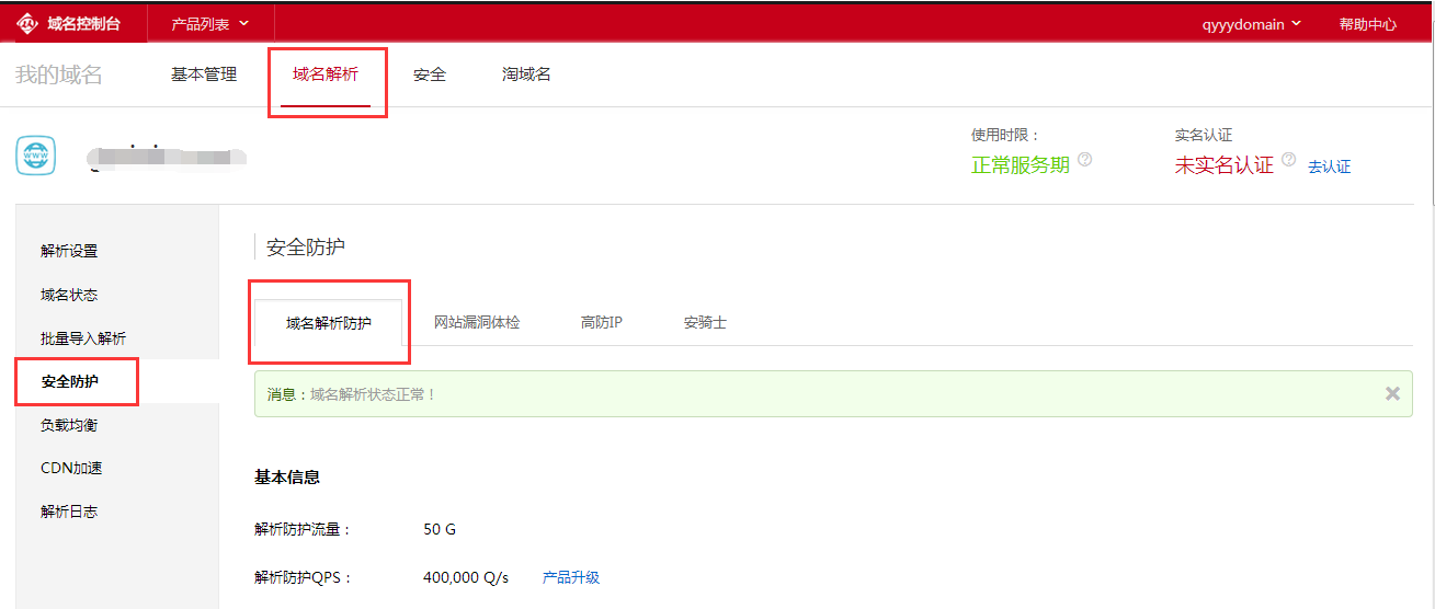 6) 如果域名解析遭受到攻擊,會在如下區(qū)域有相應(yīng)的提示