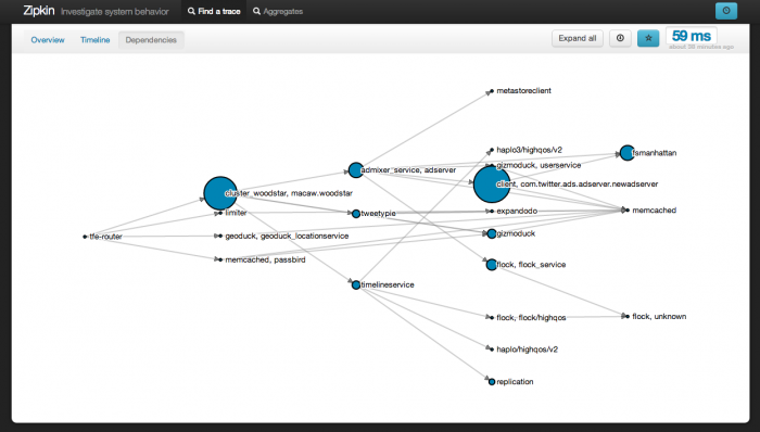 當(dāng)Twitter將要在一個(gè)快速增長(zhǎng)的巨大系統(tǒng)上啟動(dòng)越來(lái)越多的服務(wù),Twitter必須使這種工作變得輕松。運(yùn)行時(shí)系統(tǒng)組開發(fā)為大家開發(fā)了兩個(gè)工具:Viz和Zipkin。二者都暴露并集成到了Finagle,所以所有基于Finagle的服務(wù)都可以自動(dòng)的獲取到它們。