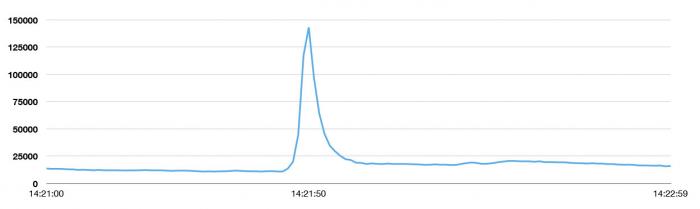 下圖是峰值發(fā)生的鄰近時(shí)間段的訪問(wèn)頻率圖,Twitter通常每天的推文數(shù)是 5 億條,平均下來(lái)每秒大概產(chǎn)生5700條。這個(gè)峰值大概是穩(wěn)定狀態(tài)下訪問(wèn)量的25倍!